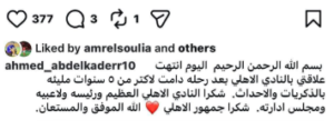 وكتب أحمد عبد القادر عبر حسابه على إنستجرام: “بسم الله الرحمن الرحيم، اليوم انتهت علاقتي بالنادي الأهلي بعد رحلة دامت لأكثر من خمس سنوات مليئة بالذكريات والأحداث”.