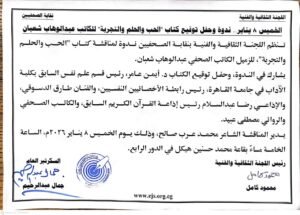 وتدار المناقشة بواسطة الشاعر محمد عرب صالح، حيث تقام الندوة يوم الخميس 8 يناير 2026، في تمام الساعة الخامسة مساءً، بقاعة محمد حسنين هيكل، بالدور الرابع بمقر نقابة الصحفيين.