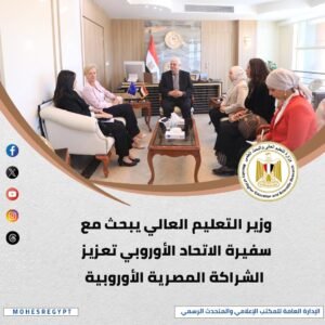 استقبال سفيرة الاتحاد الأوروبي وبحث زيادة المنح الدراسية والتبادل الطلابي لدعم الابتكار وبناء الكفاءات الشابة.