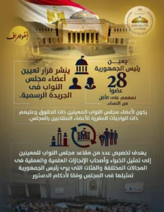 – يعين رئيس الجمهورية ٢٨ عضوا، نصفهم على الأقل من النساء.