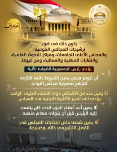 أصدرت وزارة الشؤون النيابية والقانونية والتواصل السياسي مجموعة إنفوجرافات توعوية جديدة من سلسلة توعية وتواصل التي بدأتها من قبل انتخابات مجلس النواب، بهدف تقديم كل المعلومات السياسية عن كل مراحل ومحطات انتخابات مجلس النواب ٢٠٢٥.