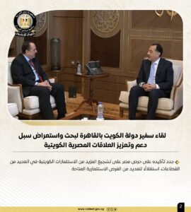 وجاء في التقرير الأسبوعي الصادر عن المركز الإعلامي لمجلس الوزراء أن نشاط الدكتور مصطفى مدبولي شمل عقد لقاء مع سفير دولة الكويت بالقاهرة لبحث واستعراض سبل دعم وتعزيز العلاقات المصرية الكويتية، حيث جدد سيادته تأكيده على حرص مصر على تشجيع المزيد من الاستثمارات الكويتية في العديد من القطاعات، استغلالًا للعديد من الفرص الاستثمارية المتاحة.