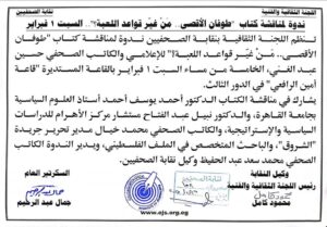 يدير الندوة الكاتب الصحفي محمد سعد عبد الحفيظ، وكيل نقابة الصحفيين، حيث تسلط الندوة الضوء على القضايا الساخنة المتعلقة بالقضية الفلسطينية، ودور التغيرات السياسية والإقليمية في تشكيل قواعد اللعبة، كما تناقش الكتاب الذي يعد شهادة هامة على التحولات الجذرية في ملف القدس والأقصى.
