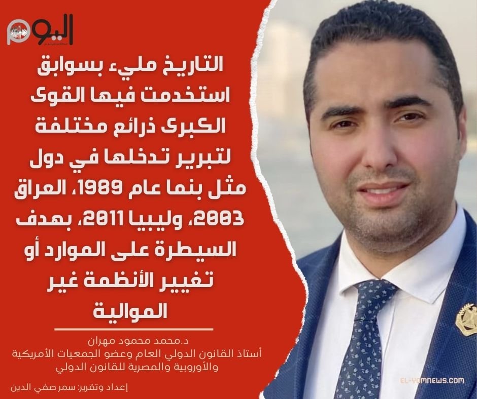 لفت مهران إلى أن التاريخ الدولي مليء بالسوابق التي استخدمت فيها القوى الكبرى ذرائع مختلفة لتبرير تدخلها في شؤون الدول الأخرى، مثل اعتقال رئيس بنما مانويل نورييغا عام 1989 بدعوى مكافحة المخدرات. وغزو العراق في 2003 بذريعة أسلحة الدمار الشامل، وتدخل ليبيا عام 2011 بذريعة حماية المدنيين. مشيرًا إلى أن الهدف كان دائمًا السيطرة على الموارد أو تغيير الأنظمة غير الموالية.