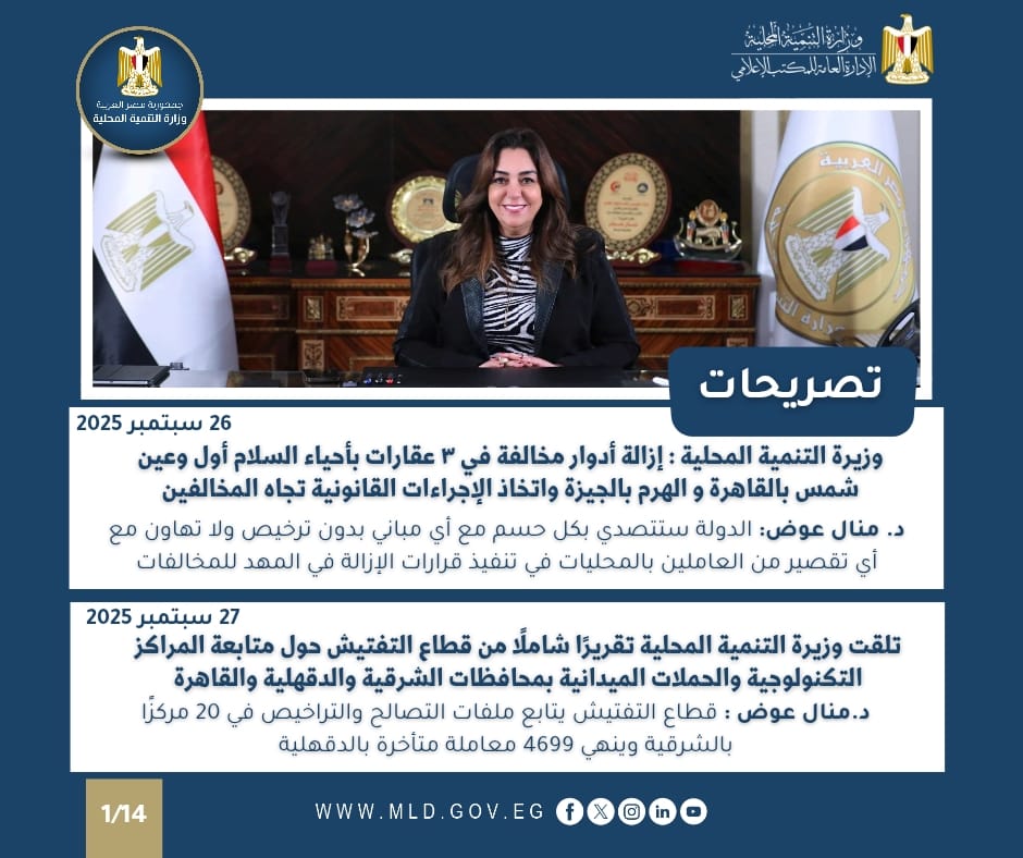 وأكدت الدكتورة منال عوض وزيرة التنمية المحلية ، أن الدولة ستتصدي بكل حسم لأي مخالفات بناء ومتغيرات مكانية غير قانونية في جميع المحافظات ، مشيرة إلى أن الوزارة لن تتهاون مع أي تقصير في تنفيذ قرارات الإزالة الصادرة ضد المخالفات البنائية واتخاذ الاجراءات القانونية تجاه المخالفين، جاء ذلك خلال استعراض الدكتورة منال عوض تقريراً حول جهود قطاع التفتيش والمتابعة بالوزارة للتصدي لمخالفات البناء في عدد من أحياء محافظتي القاهرة والجيزة .