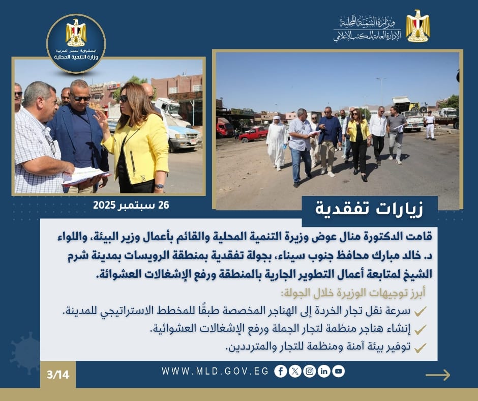 كما قامت وزيرة التنمية المحلية ومحافظ جنوب سيناء بتفقد منطقة الخردة بقطاع الرويسات، حيث وجهت بسرعة نقل التجار إلى الهناجر المخصصة طبقًا للمخطط الاستراتيجي للمدينة، بما يضمن الارتقاء بالمظهر الحضاري للمنطقة. كما قامت بتفقد منطقة تجار الجملة بالرويسات، ووجهت بإنشاء هناجر خاصة بهم، مع رفع كافة الإشغالات العشوائية وتوفير بيئة منظمة وآمنة للتجار والمترددين، بما يتماشى مع جهود الدولة لتحويل الرويسات إلى مجتمع حضاري متكامل.