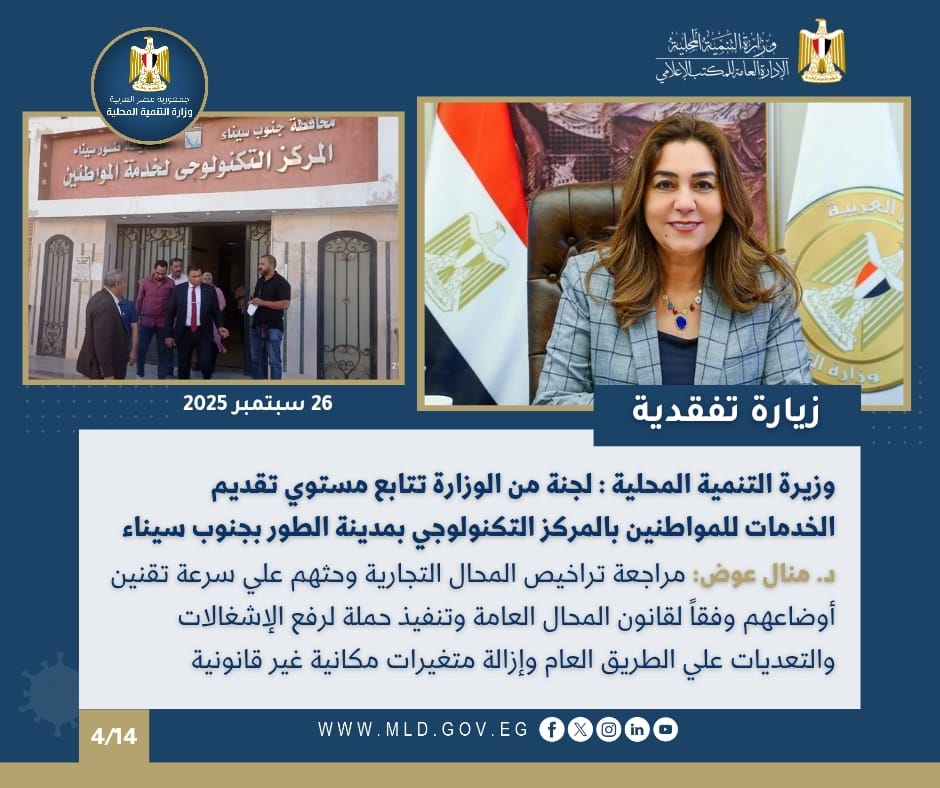كما تلقت الدكتورة منال عوض وزيرة التنمية المحلية، تقريرًا حول نتائج الزيارة الميدانية التي قامت بها الإدارة العامة للمراجعة الداخلية والحوكمة علي مركز ومدينة الطور بمحافظة جنوب سيناء، لمتابعة سير العمل على أرض الواقع والوقوف على مستوى الأداء والخدمات المقدمة للمواطنين ، وذلك بتكليف مباشر من الوزيرة خلال زيارتها التفقدية لمحافظة جنوب سيناء .