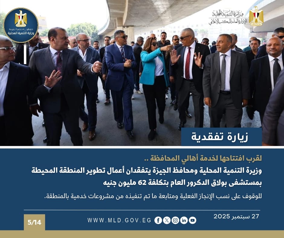 أجرت الدكتورة منال عوض وزيرة التنمية المحلية والمهندس عادل النجار محافظ الجيزة جولة ميدانية لتفقد أعمال التطوير الجارية بمحيط مستشفى بولاق الدكرور العام، للوقوف على نسب الإنجاز الفعلية ومتابعة ما تم تنفيذه من مشروعات خدمية بالمنطقة.
