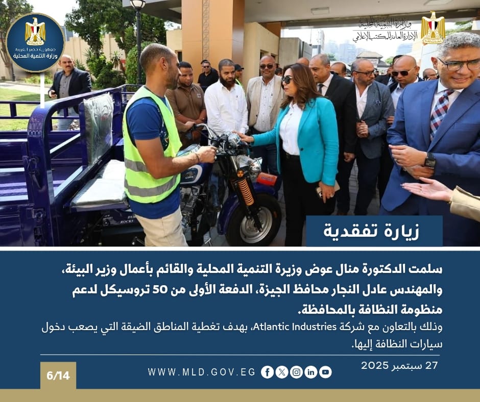 كما قامت الدكتورة منال عوض وزيرة التنمية المحلية والقائم بأعمال وزير البيئة، محافظ الجيزة، بتسليم دفعة أولي من 50 تروسيكل للعاملين في منظومة النظافة بالمحافظة ، وذلك في إطار جهود وزارة البيئة لتعزيز المشاركة المجتمعية، حيث قامت الوزارة بالتعاون مع شركة Atlantic Industries لتغطية المناطق التي لا تتمكن سيارات المحافظة من الدخول إليها.