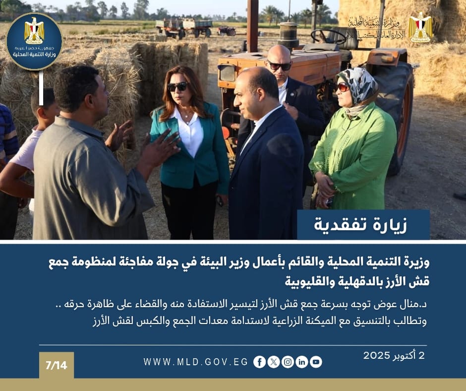 قامت الدكتورة منال عوض وزيرة التنمية المحلية والقائم بأعمال وزير البيئة بجولة تفقدية مفاجئة لمواقع تجميع قش الأرز بمحافظتي الدقهلية والقليوبية، وذلك في إطار متابعتها الحثيثة لتنفيذ منظومة مواجهة نوبات تلوث الهواء الحادة المعروفة بظاهرة السحابة السوداء، والتي يتم تنفيذها بالتعاون مع عدد من الوزارت والجهات المعنية.