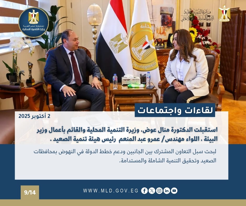 كما استقبلت الدكتورة منال عوض، وزيرة التنمية المحلية اللواء مهندس عمرو عبد المنعم رئيس هيئة تنمية الصعيد ، بمقر الوزارة بالعاصمة الإدارية الجديدة، لبحث سبل التعاون المشترك بين الجانبين ودعم خطط الدولة في النهوض بمحافظات الصعيد وتحقيق التنمية الشاملة والمستدامة.