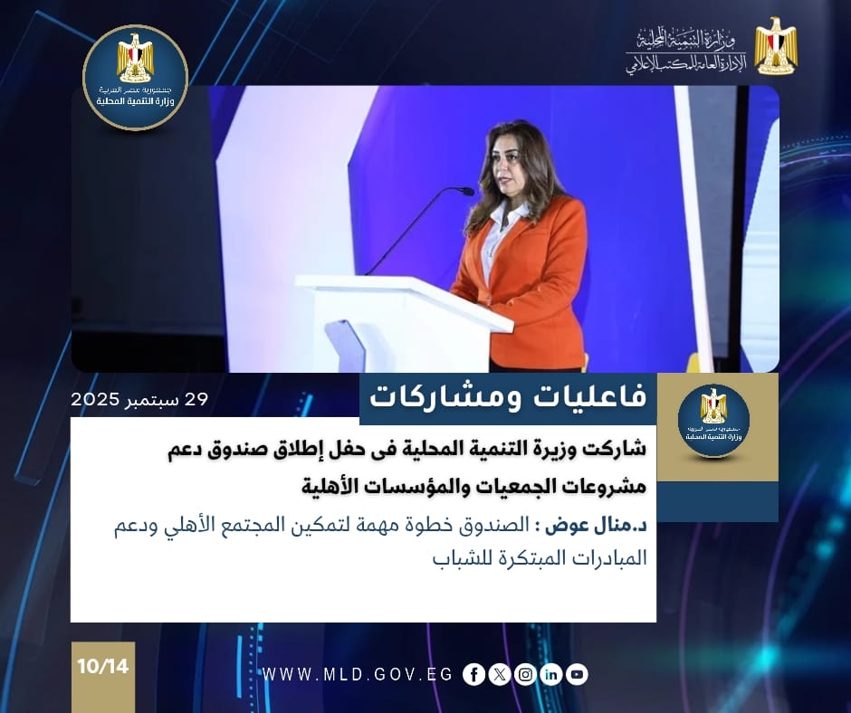 شاركت الدكتورة منال عوض وزيرة التنمية المحلية فى مؤتمر وزارة التضامن الاجتماعي لإطلاق صندوق دعم مشروعات الجمعيات والمؤسسات الأهلية بأحد فنادق القاهرة تحت شعار ” نحو بيئة داعمة وممكنة لمبادرات ومؤسسات المجتمع الأهلي الناشئة ” وذلك بحضور الدكتورة مايا مرسى وزيرة التضامن الاجتماعي والدكتور عمرو طلعت وزير الاتصالات وتكنولوجيا المعلومات وعدد من أعضاء مجلس النواب ومؤسسات المجتمع الأهلى ورواد العمل المجتمعي والقطاع الخاص وسفيرة الاتحاد الأوروبي بالقاهرة والممثلة المقيمة للأمم المتحدة في مصر وعدد من شركاء التنمية والجهات الحكومية والبحثية .