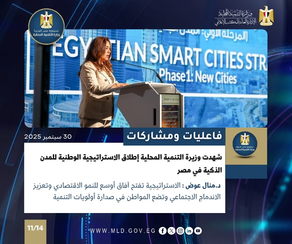 شاركت الدكتورة منال عوض وزيرة التنمية المحلية في حفل إطلاق الاستراتيجية الوطنية للمدن الذكية في مصر، حيث أكدت إن الاستراتيجية الوطنية للمدن الذكية في مصر، تمثل نقلة نوعية في مسار التنمية العمرانية المستدامة ، وأشارت د.منال عوض إلى أن الاستراتيجية الوطنية جاءت لتواجه التحديات الملحّة الناتجة عن التسارع العمراني، وتعزيز العدالة المكانية، ومواكبة متغيرات المناخ.