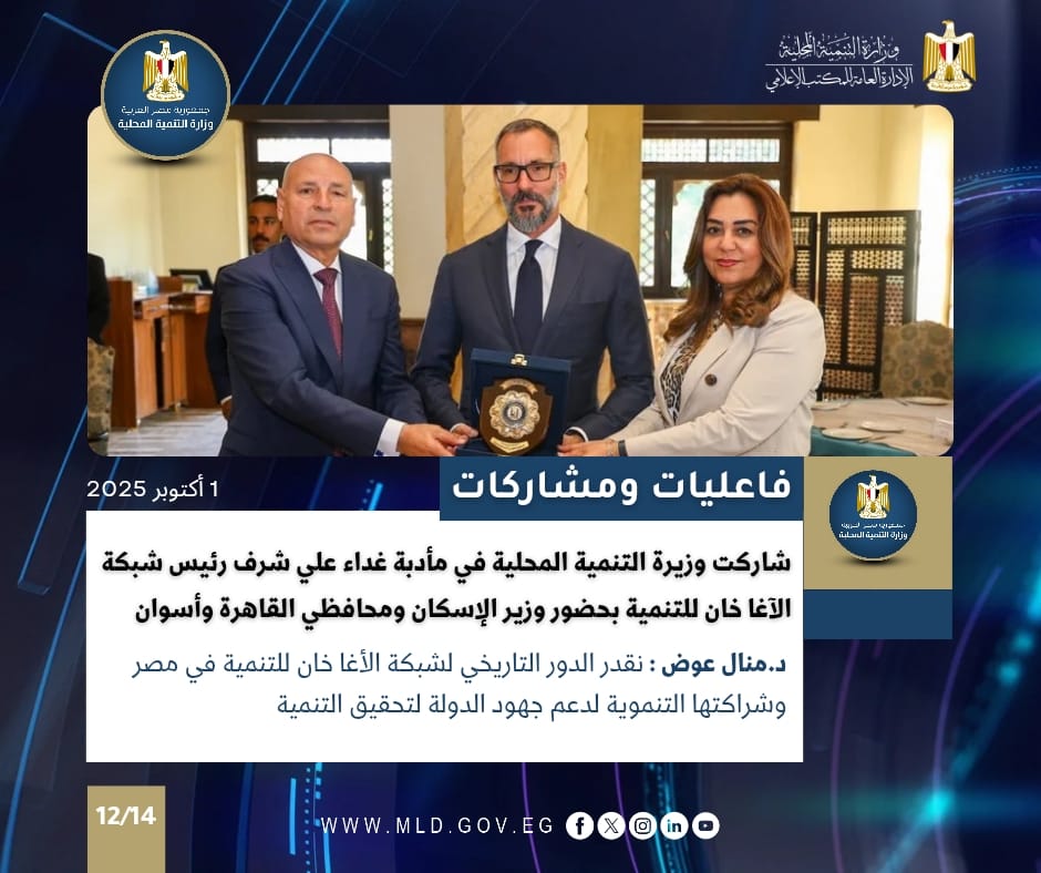 شاركت الدكتورة منال عوض وزيرة التنمية المحلية في مأدبة الغداء التي أقامتها شبكة الآغا خان للتنمية بحديقة الأزهر بمحافظة القاهرة علي شرف الزيارة التي يقوم بها الأمير رحيم آغا خان، رئيس شبكة الآغا خان للتنمية للبلاد ، وذلك بحضور المهندس شريف الشربيني وزير الإسكان والمرافق والمجتمعات العمرانية و لويس مونريل، المدير العام لصندوق أغا خان للثقافة واللواء دكتور إسماعيل كمال محافظ أسوان والدكتور إبراهيم صابر محافظ القاهرة وقيادات وزارتي التنمية المحلية والإسكان ومحافظ القاهرة وشبكة الآغا خان للتنمية بالقاهرة.