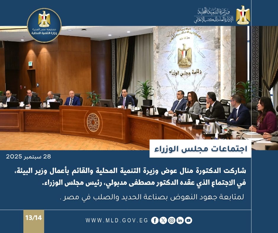 شاركت الدكتورة منال عوض وزيرة التنمية المحلية والقائم بأعمال وزير البيئة، في الاجتماع الذي عقده الدكتور مصطفى مدبولي، رئيس مجلس الوزراء، لمتابعة جهود النهوض بصناعة الحديد والصلب في مصر .