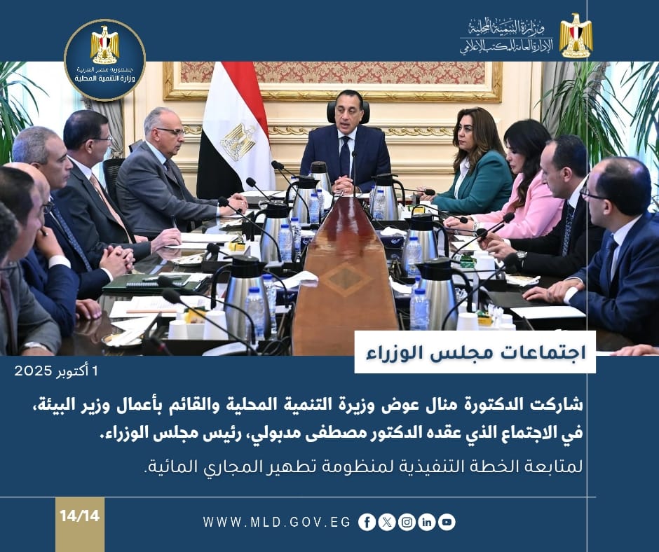 شاركت الدكتورة منال عوض وزيرة التنمية المحلية والقائم بأعمال وزير البية، في الاجتماع الذي عقده الدكتور مصطفى مدبولي، رئيس مجلس الوزراء، لمتابعة الخطة التنفيذية لمنظومة تطهير المجاري المائية.