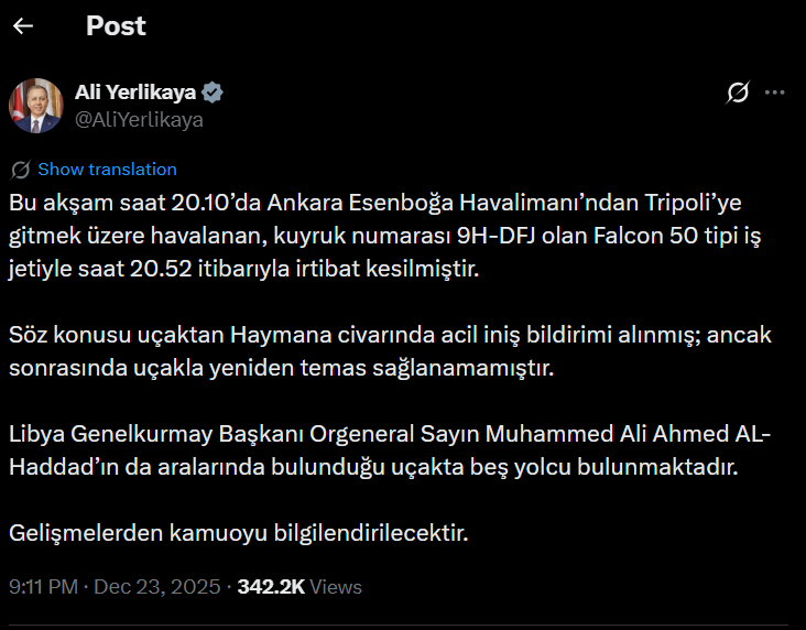أعلن وزير الداخلية التركي علي يرلي كايا ، اليوم الثلاثاء، فقدان الاتصال بطائرة خاصة تقل رئيس الأركان العامة الليبي محمد علي أحمد الحداد، بعد إقلاعها من مطار أنقرة إيسنبوغا مساء الثلاثاء متجهة إلى العاصمة الليبية طرابلس.