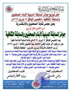 نقابة الصحفيين بالإسكندرية تعلن عن حفل توزيع الجوائز الدينية والثقافية