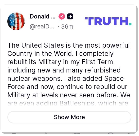 في تدوينة حديدة للرئيس الأمريكي “دونالد ترامب”، اليوم- الخميس، على موقع التواصل الاجتماعي تروث سوشيال، راح يفاخر بما حققه لبلاده خلال توليه رئاستها، فقال: “الولايات المتحدة الدولة الأقوى على مستوى العالم، وقد تمكنت من إعادة بناء جيشها بالكامل، خلال فترة رئاستي الأولى”