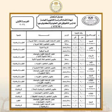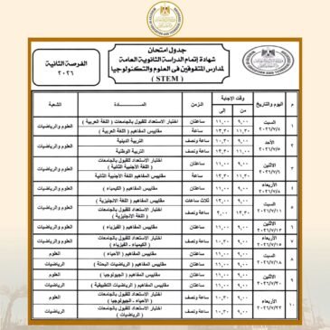 كما أوضحت الوزارة أن امتحانات مدارس المتفوقين STEM (الفرصة الأولى) تبدأ يوم 16 مايو 2026 وتستمر حتى 20 يونيو 2026، بينما تُعقد امتحانات الفرصة الثانية بداية من يوم السبت 4 يوليو 2026 حتى 22 يوليو 2026.