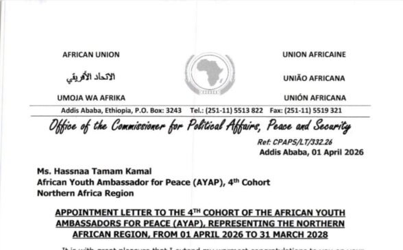 في خطوة تُعد سابقة مهمة، اختيرت حسناء تمام كأول مصرية تتولى منصب سفيرة الشباب للسلام في شمال أفريقيا، في إطار برنامج سفراء الشباب للسلام التابع للاتحاد الأفريقي (AYAPs).