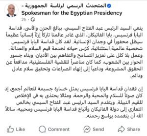 الرئيس المصري عبد الفتاح السيسي وصف البابا الراحل بأنه “شخصية استثنائية”، مشيرًا إلى أن رحيله “خسارة جسيمة للعالم”، لما قدمه من جهود عظيمة في دعم قيم السلام والعدالة الاجتماعية. وأضاف: “قداسته كان من أبرز المناصرين للقضية الفلسطينية، ودعا باستمرار إلى تحقيق سلام عادل ودائم، وإنهاء النزاعات المسلحة”.
