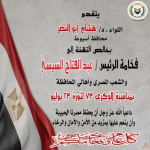 “فخامة الرئيس عبدالفتاح السيسي، رئيس جمهورية مصر العربية… بمشاعر يملؤها الاعتزاز بشخصكم الكريم، وتقديرًا لقيادتكم الوطنية الرشيدة، يسعدني بالأصالة عن نفسي وبالنيابة عن أبناء محافظة أسيوط أن أبعث لسيادتكم بخالص التهاني القلبية وأطيب التمنيات بمناسبة الذكرى الثالثة والسبعين لثورة 23 يوليو المجيدة، تلك الثورة التي أرست دعائم العدالة الاجتماعية والمساواة والكرامة الإنسانية، وندعو الله العلي القدير أن يعيد هذه المناسبة الوطنية المجيدة عليكم بموفور الصحة ودوام التوفيق، وأن يوفقكم دائمًا لما فيه خير الوطن، وأن تواصلوا مسيرة البناء والتنمية من أجل مستقبل أكثر إشراقًا لمصرنا الغالية. حفظكم الله ورعاكم، وكل عام وسيادتكم بخير ورفعة وازدهار”.