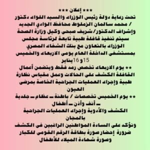 وأكد كمال الدين أن الكشف والعلاج وإجراء العمليات الجراحية مجاني، وشدد على ضرورة إحضار بطاقة الرقمي القومى للكبار وشهادة الميلاد للأطفال.