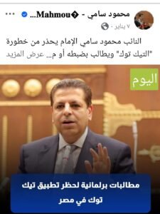 قال النائب محمود سامي الإمام:”بسبب تيك توك أنا في حرب خاسرة مع ابني الصغير، مصدر معلوماته وثقافته الأساسي هو التطبيق وسبق وطلبت أننا إذا لم نستطع ضبط محتواه، فيجب منعه تماماً في مصر، نحن في حزب تقدمي يدعم الإبداع، لكن التطبيق يعاني من انعدام الضوابط، لذا يجب اتخاذ موقف حازم.”
