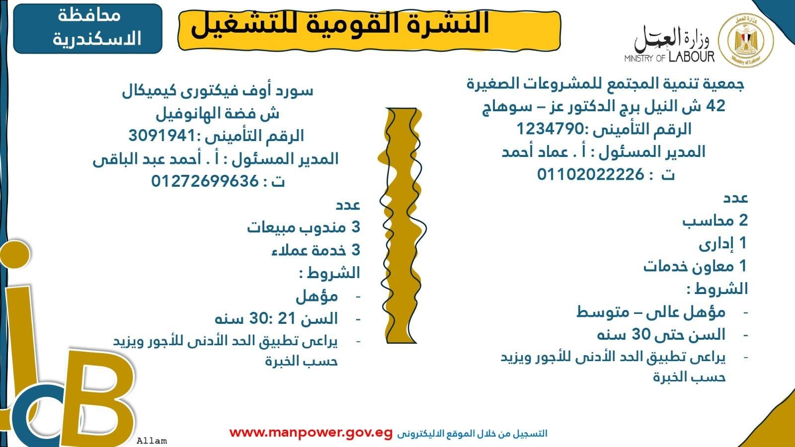 أصدرت وزارة العمل اليوم الجمعة، نشرة التوظيف نصف الشهرية، التي تُعلن فيها عن فرص عمل جديدة في المحافظات، تنسيقًا مع شركات القطاع الخاص.