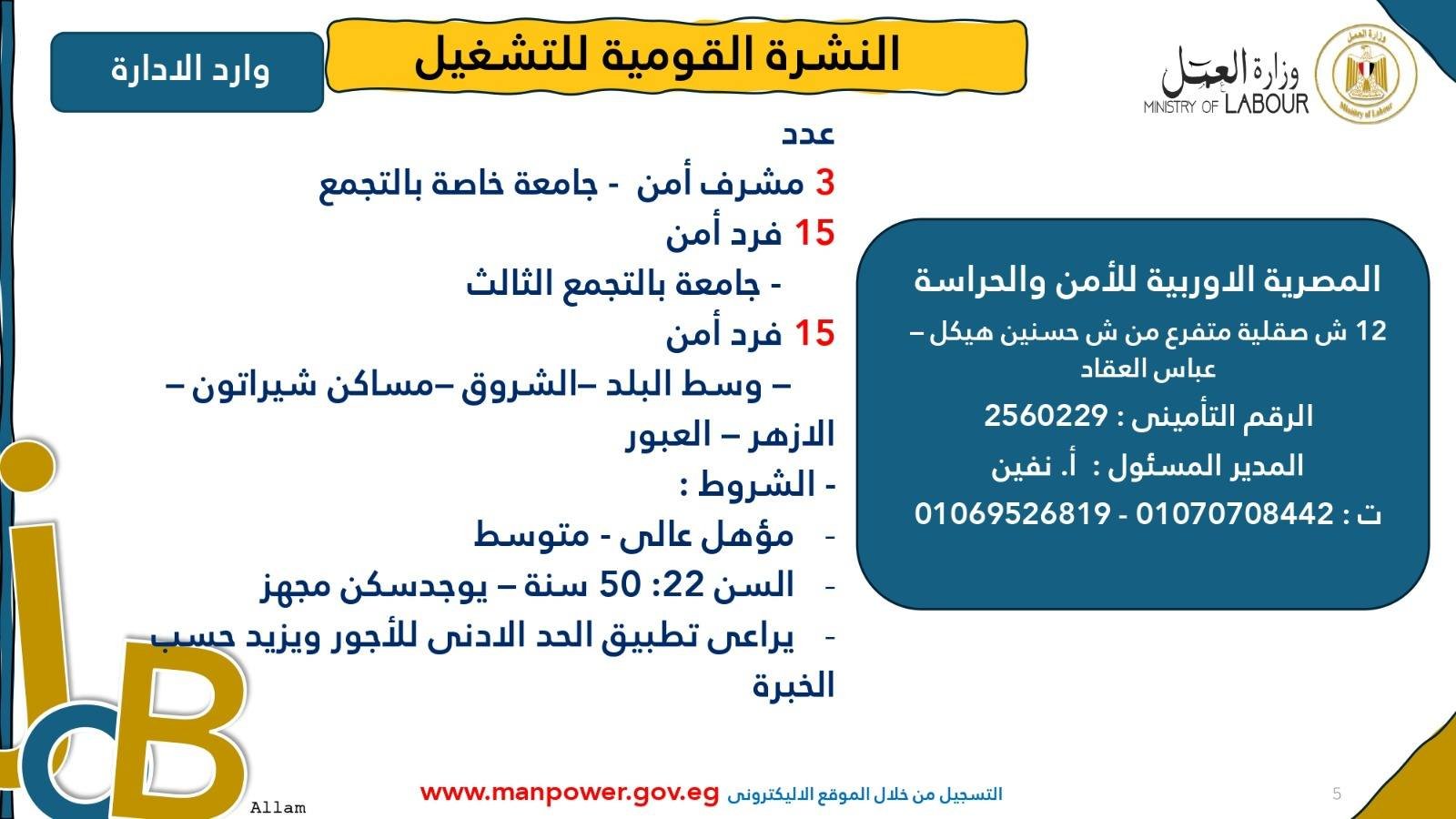 وأوضحت “الوزارة” أن التقديم على هذه “الفرص الجديدة” خلال شهر يوليو و أغسطس 2025، عن طريق مكتب الإدارة العامة للتشغيل بمقر “الوزارة” القديم بمدينة نصر،أو مديريات العمل بالمحافظات ، أو أرقام وعناوين الشركات المُرفقة مع هذا البيان، وكذلك على الموقع الرسمي لوزارة العمل على “الإنترنت”.