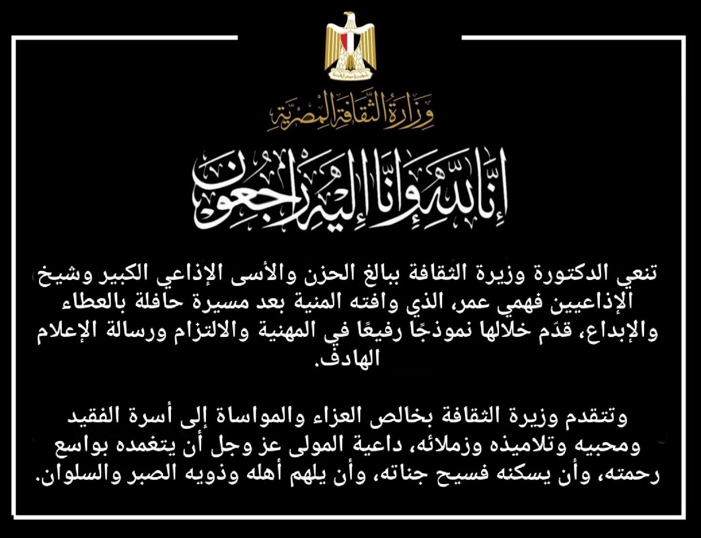 تنعي الدكتورة جيهان زكي، وزيرة الثقافة، ببالغ الحزن والأسى الإذاعي الكبير فهمي عمر، شيخ الإذاعيين، الذي رحل عن عالمنا بعد رحلة طويلة من العطاء المهني والإبداع الإعلامي، ترك خلالها بصمة راسخة ونموذجًا يُحتذى في الالتزام والرسالة الإعلامية الهادفة.