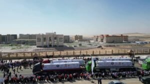 دشّن اللواء دكتور محمد الزملوط محافظ الوادي الجديد وحنان مجدي نائب المحافظ، في مشهدٍ مهيب يُجسّد معاني الأخوة والمآزرة، ووسط مسيرةٍ حافلة جابت شوارع المحافظة، صباح اليوم، انطلاق أسطول قوافل المساعدات الإغاثية المتجهة من محافظة الوادي الجديد إلى غزة، ضمن الجهود المصرية الحثيثة الصادقة الرامية إلى إعادة إعمار القطاع وإرساء دعائم الاستقرار. وذلك من أمام النصب التذكاري والعاصمة الإدارية الجديدة لمحافظة الوادي الجديد، بحضور قيادات المحافظة التنفيذية والأمنية والشعبية، ورجال الدين، وممثلي الأحزاب السياسية، والعاملين بالقطاع الحكومي وطلاب المدارس وأهالي المحافظة.