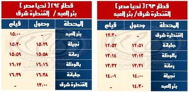 أعلنت الهيئة القومية لسكك حديد مصر مواعيد تشغيل القطارات على خط القنطرة شرق/ بئر العبد وخط بشتيل / كفر داوود/ السادات والعكس، باستخدام عربات “تحيا مصر”.