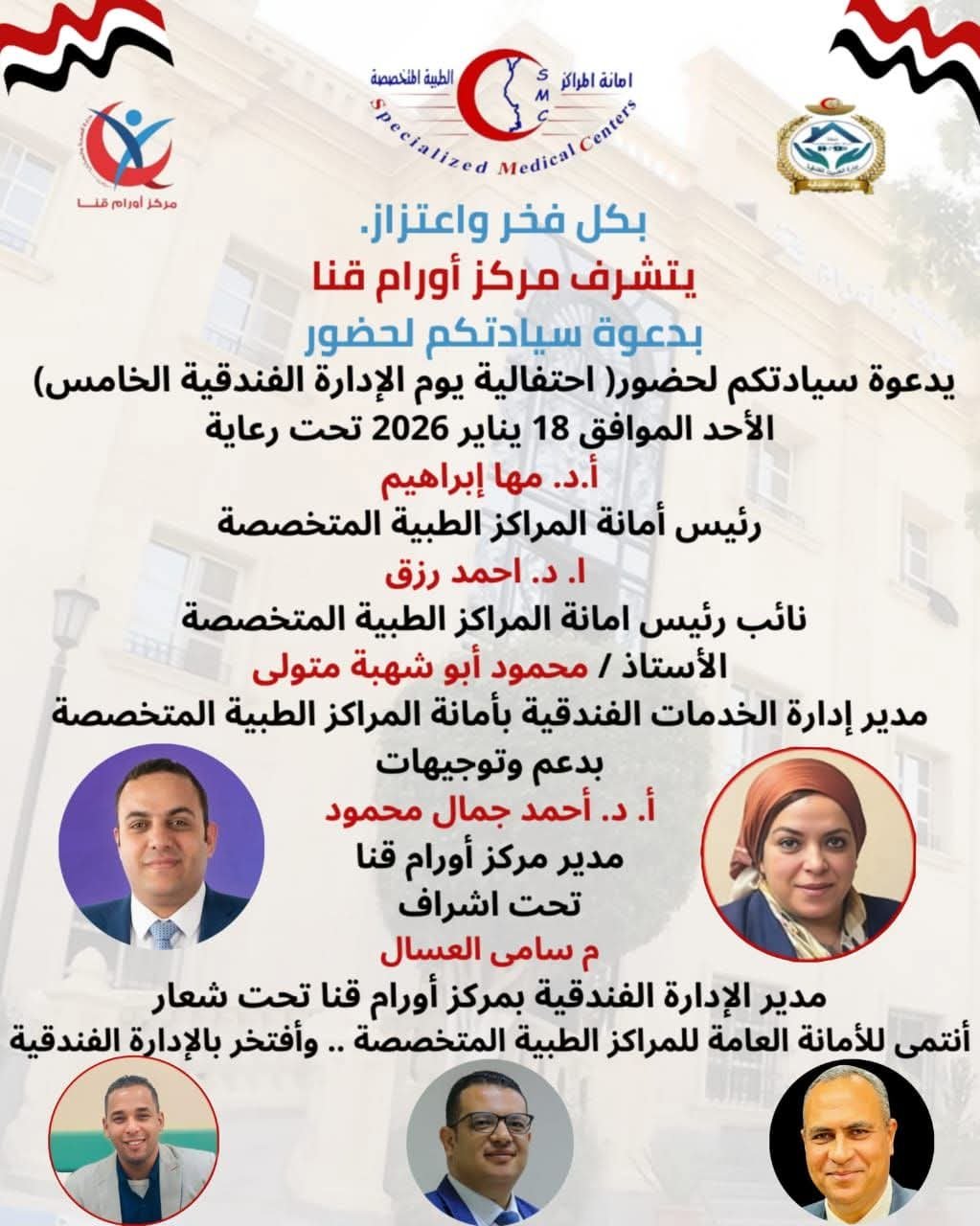 كتب – بهاء عمران يستعد مركز أورام قنا، التابع لأمانة المراكز الطبية المتخصصة، لتنظيم احتفالية كبرى بمناسبة “يوم الإدارة الفندقية…