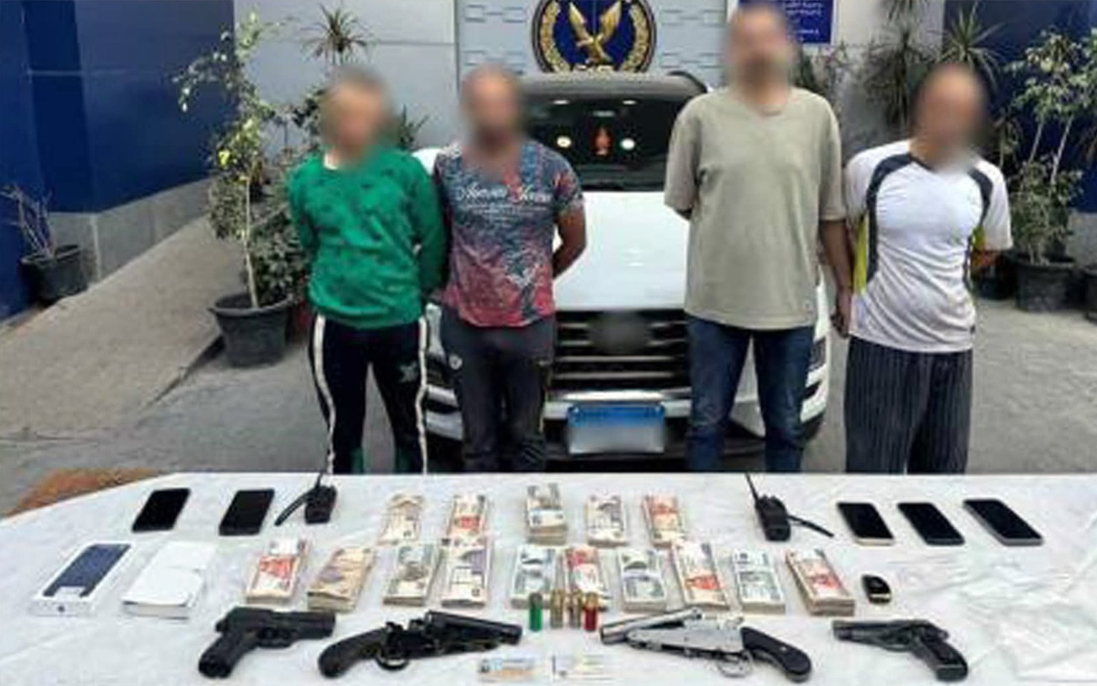 وبالفحص، أمكن تحديد وضبط مرتكبي الواقعة وهم 4 أشخاص، أحدهم له معلومات جنائية، مقيمون بمحافظة الجيزة، وبحوزتهم 2 فرد خرطوش، و2 طبنجة صوت، وكمية من مخدر الآيس، والسيارة المستخدمة في ارتكاب الواقعة، وتم ضبط المسروقات المستولى عليها.